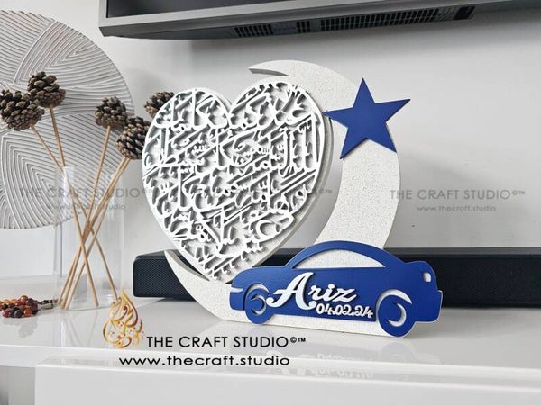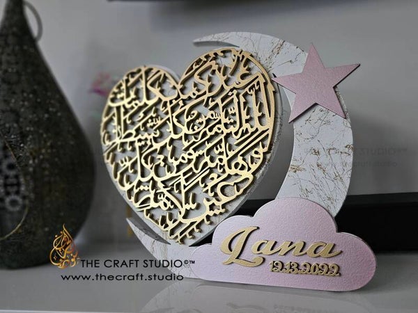 Give a meaningful, luxurious, and faith-inspired gift with our Personalised Muslim Newborn or Children's Gift featuring the Islamic Protection Dua (Prayer). This exclusive handcrafted Islamic gift is designed in a charming heart, moon, and star /hotair balloon motif, symbolising love, serenity, and guidance.